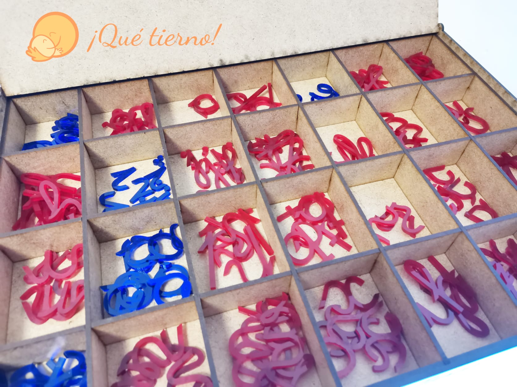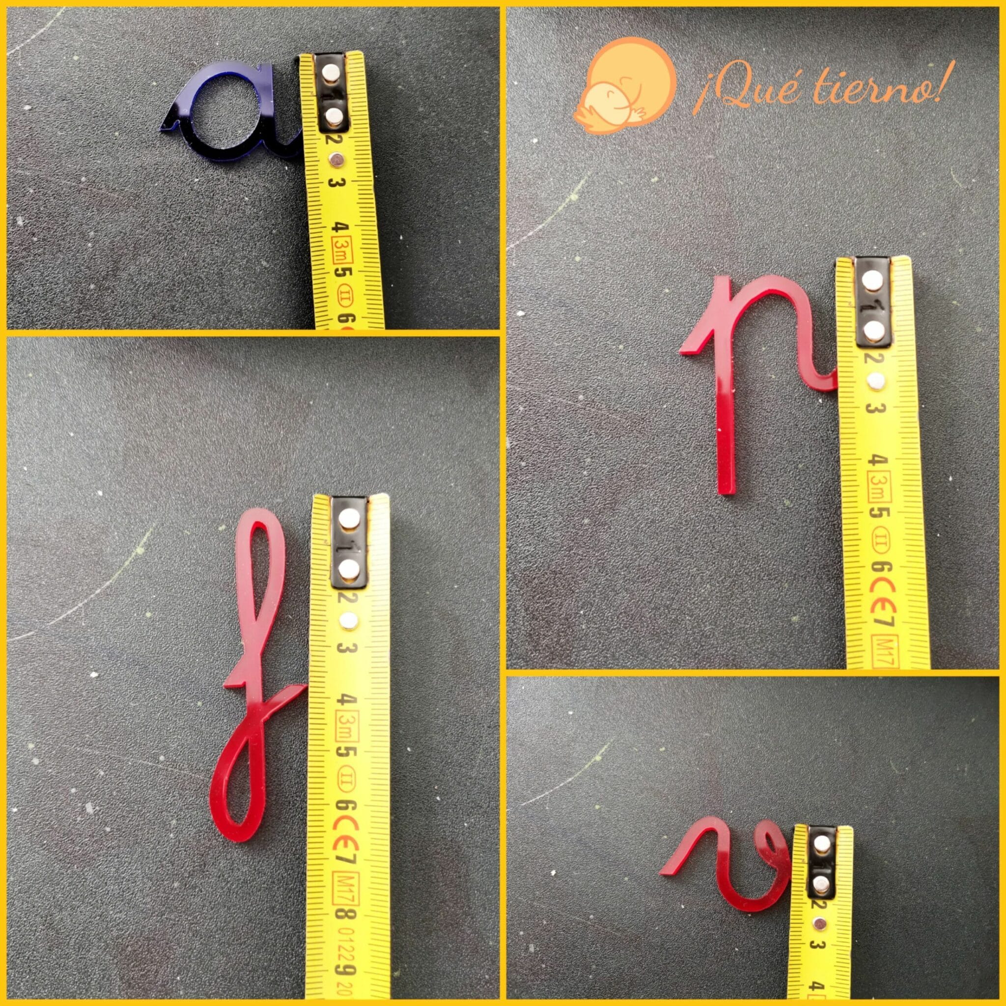 Fabricado en metacrilato traslúcido azul para las vocales y rojo para las consonantes (o al revés bajo petición) para una experiencia aún más atractiva ya que se puede usar con la mesa de luz!!