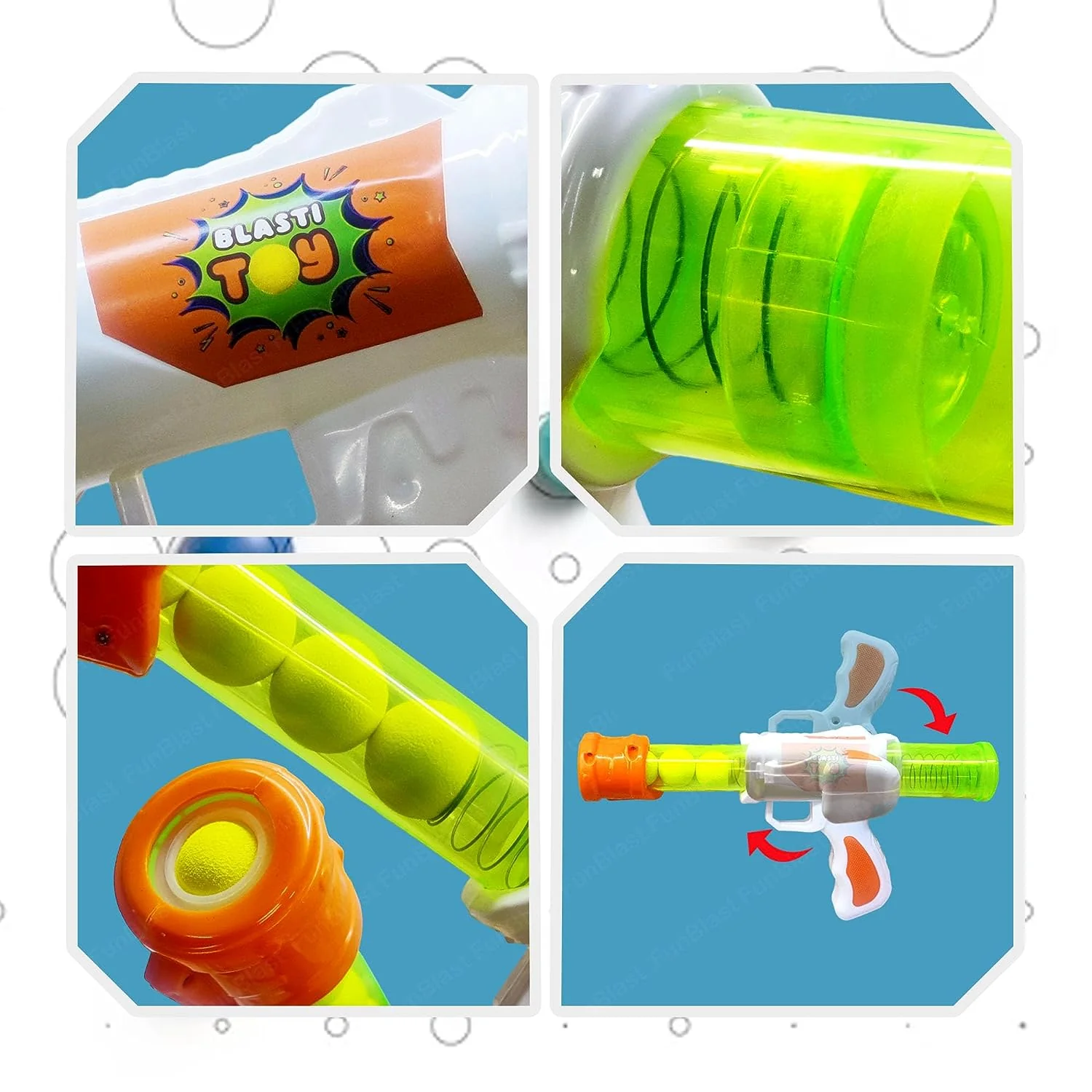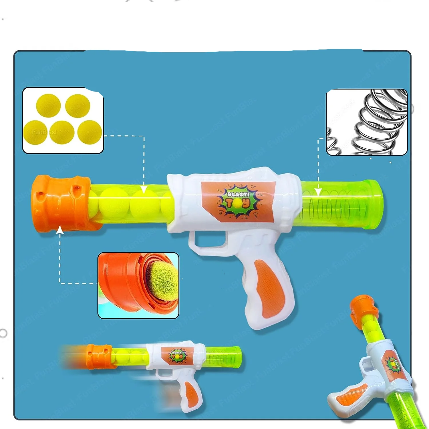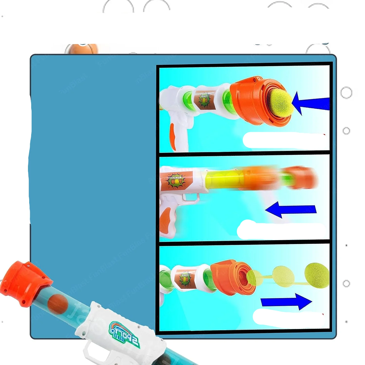 - Impulsado por aire comprimido: ¡No necesita pilas! Carga la bola de espuma, bombea y dispara.