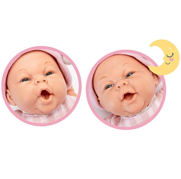 Se despereza y se mueve rie, llora, balbucea y bosteza,respira para dormirse.Como un Bebé de verdad