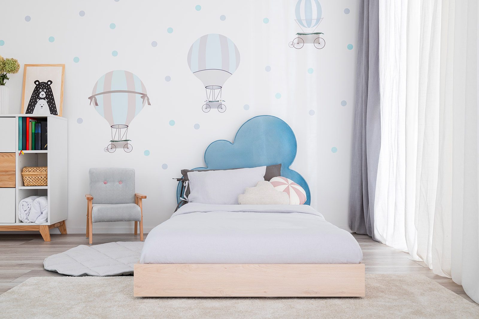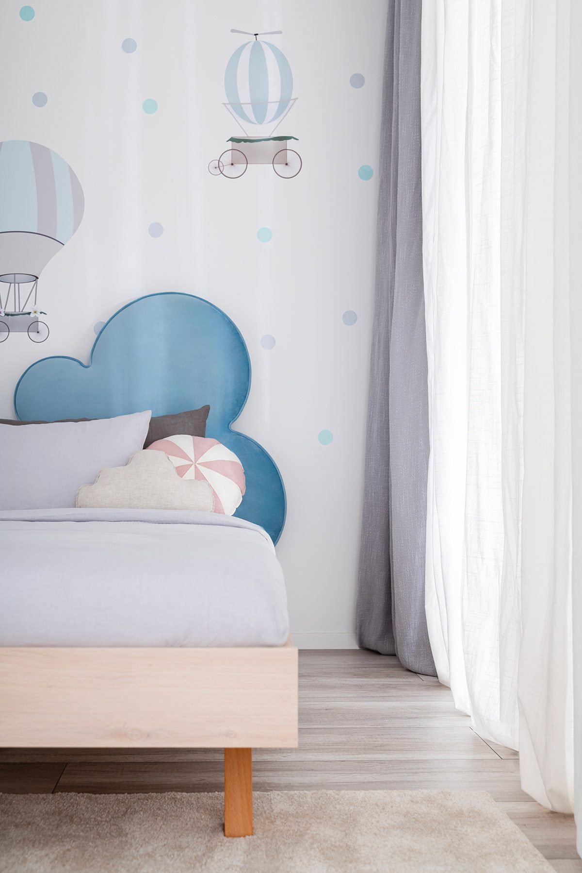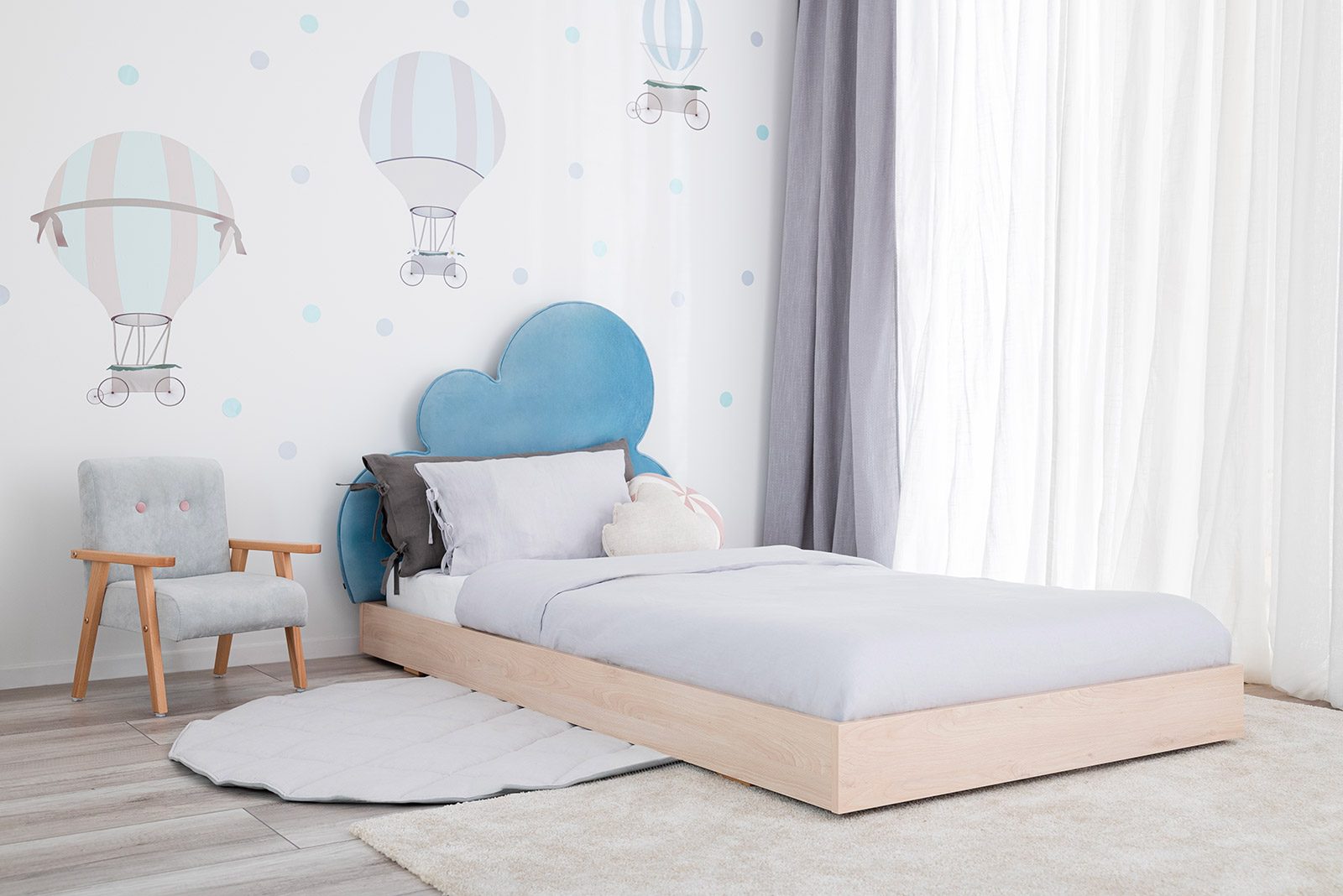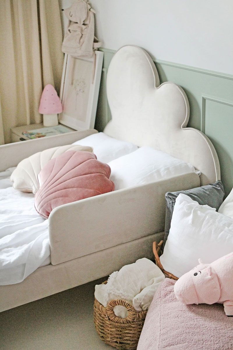 Gracias a las ruedas, el cajón se desliza sin esfuerzo, incluso cuando está completamente lleno. Es un lugar práctico para guardar ropa de cama, textiles u objetos de uso diario que quieras tener a mano pero ordenados y fuera de la vista. Una solución simple que ayuda a mantener el orden sin renunciar a la estética limpia de la habitación infantil.