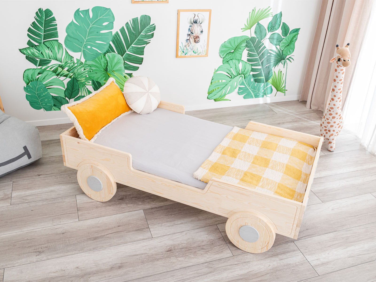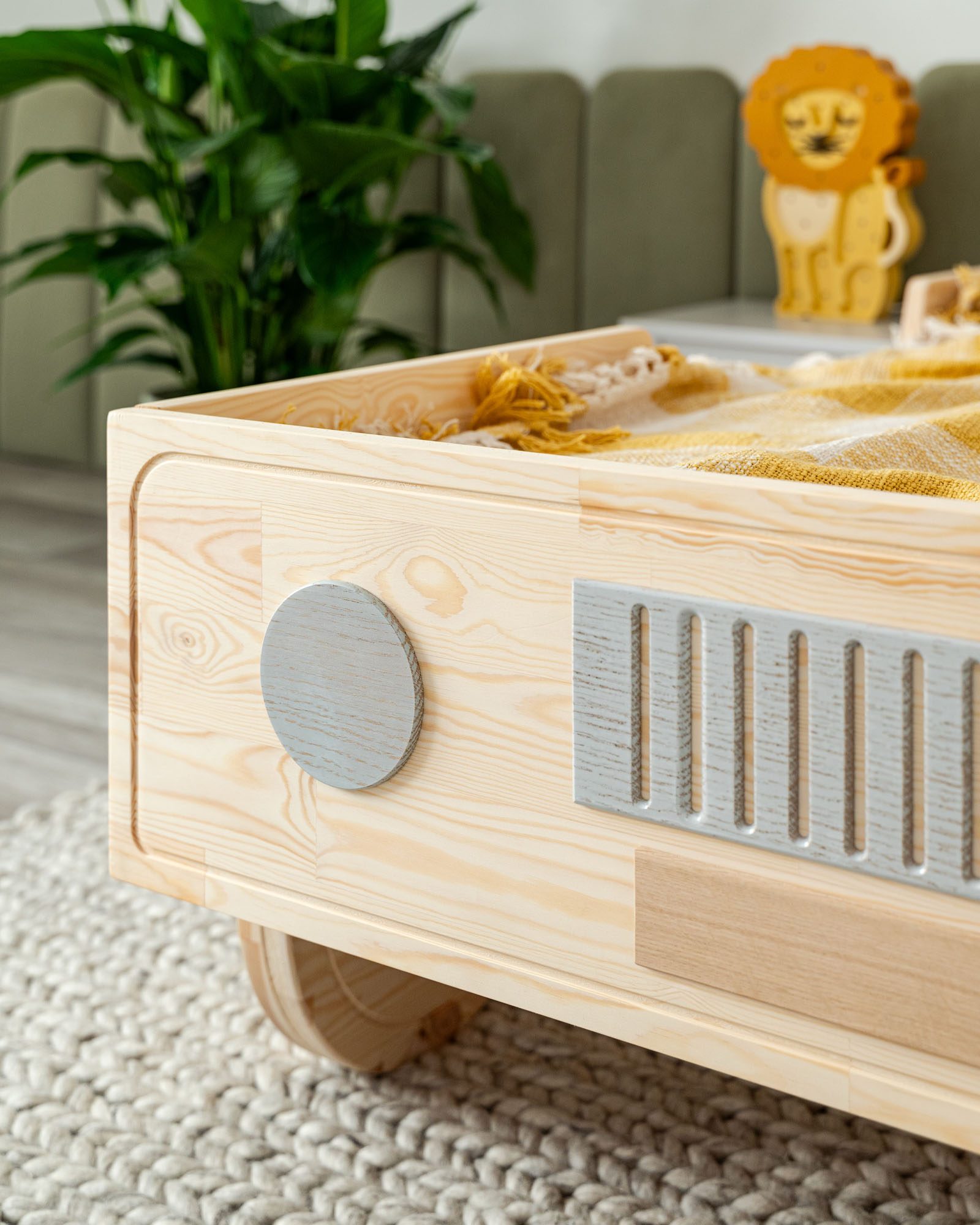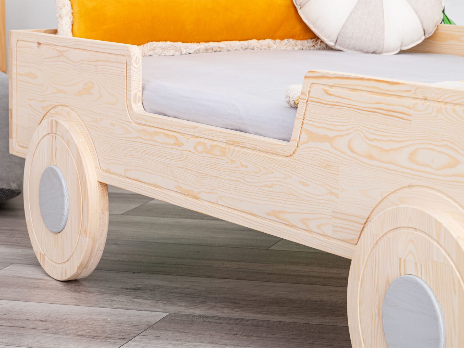 Puede que la cama con forma de coche tenga un diseño único, pero sabemos que el aspecto no lo es todo: por eso fabricamos nuestras camas con madera maciza de alta calidad. En este caso, se trata de pino escandinavo. ¿Qué lo hace especial? Crece muy lentamente en la naturaleza, lo que hace que la madera sea más densa y resistente. Esto significa que las camas hechas con esta madera son excepcionalmente estables y duraderas. Además, los elementos decorativos están hechos de madera de roble natural.