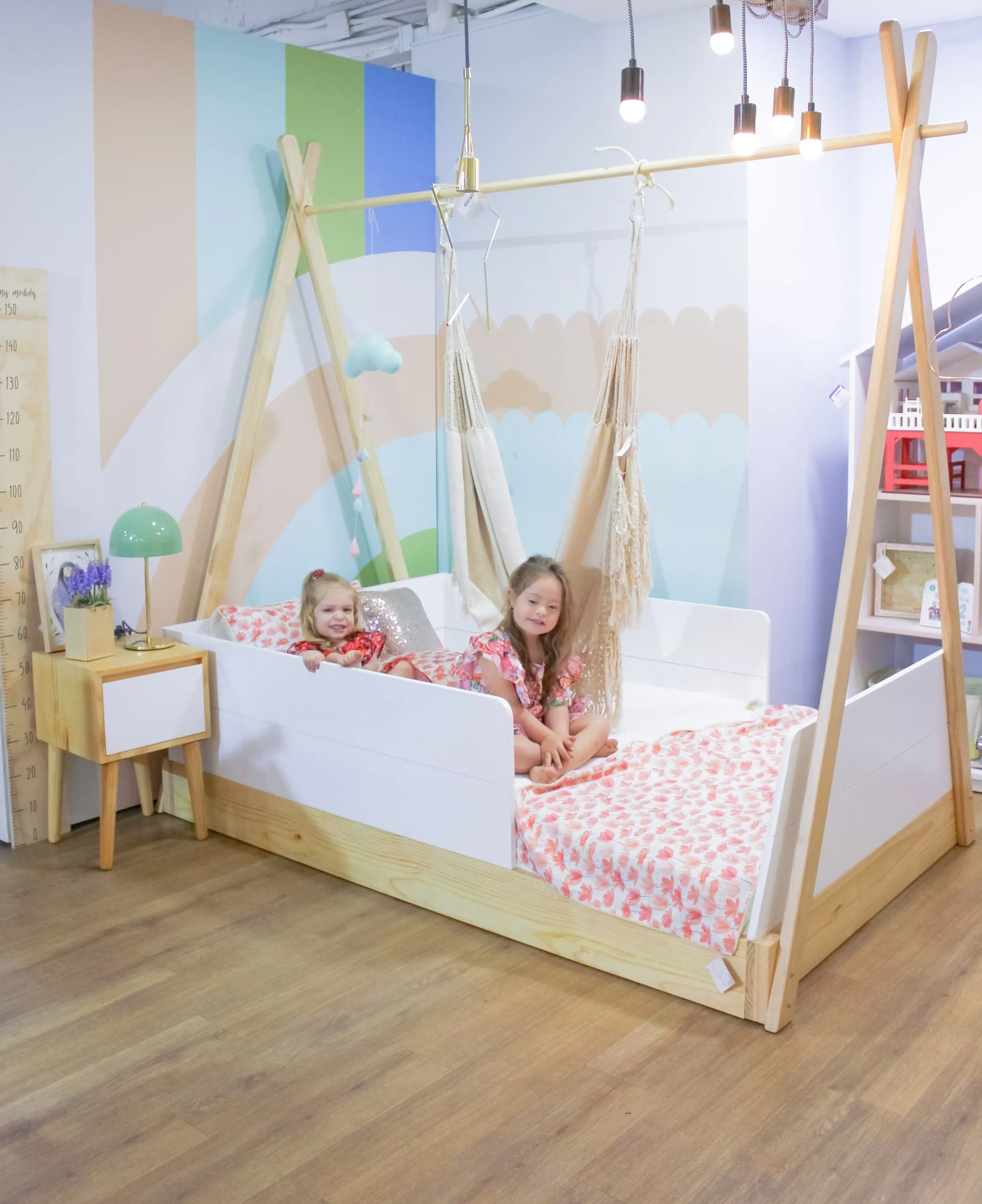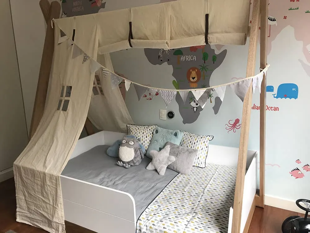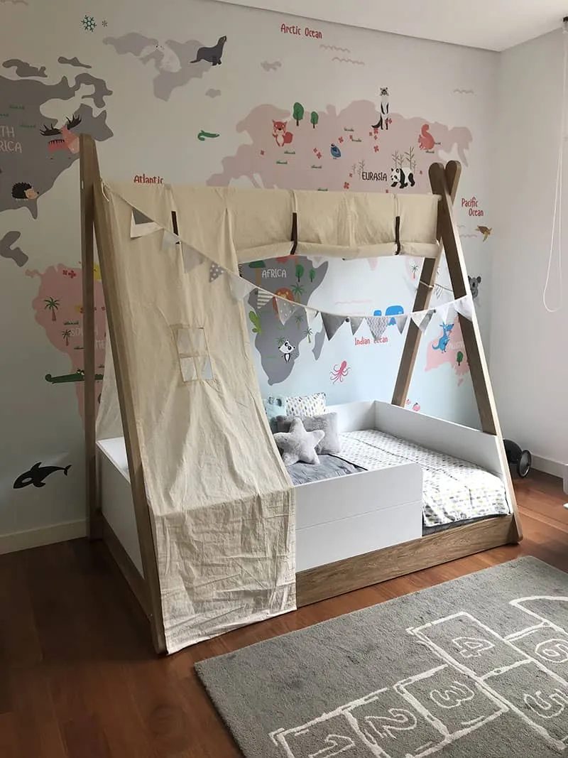 Cama estilo teepee es una tendencia a nivel mundial, su altura hace que sea una cama estilo Montessori, ideal para niños entre 1 y 4 años de edad, la puedes hacer en 3 diferentes maderas, pino natural, roble ó cedro y en diferentes acabados, medidas 100 cm x 190 cm – 120 cm x 190 cm
