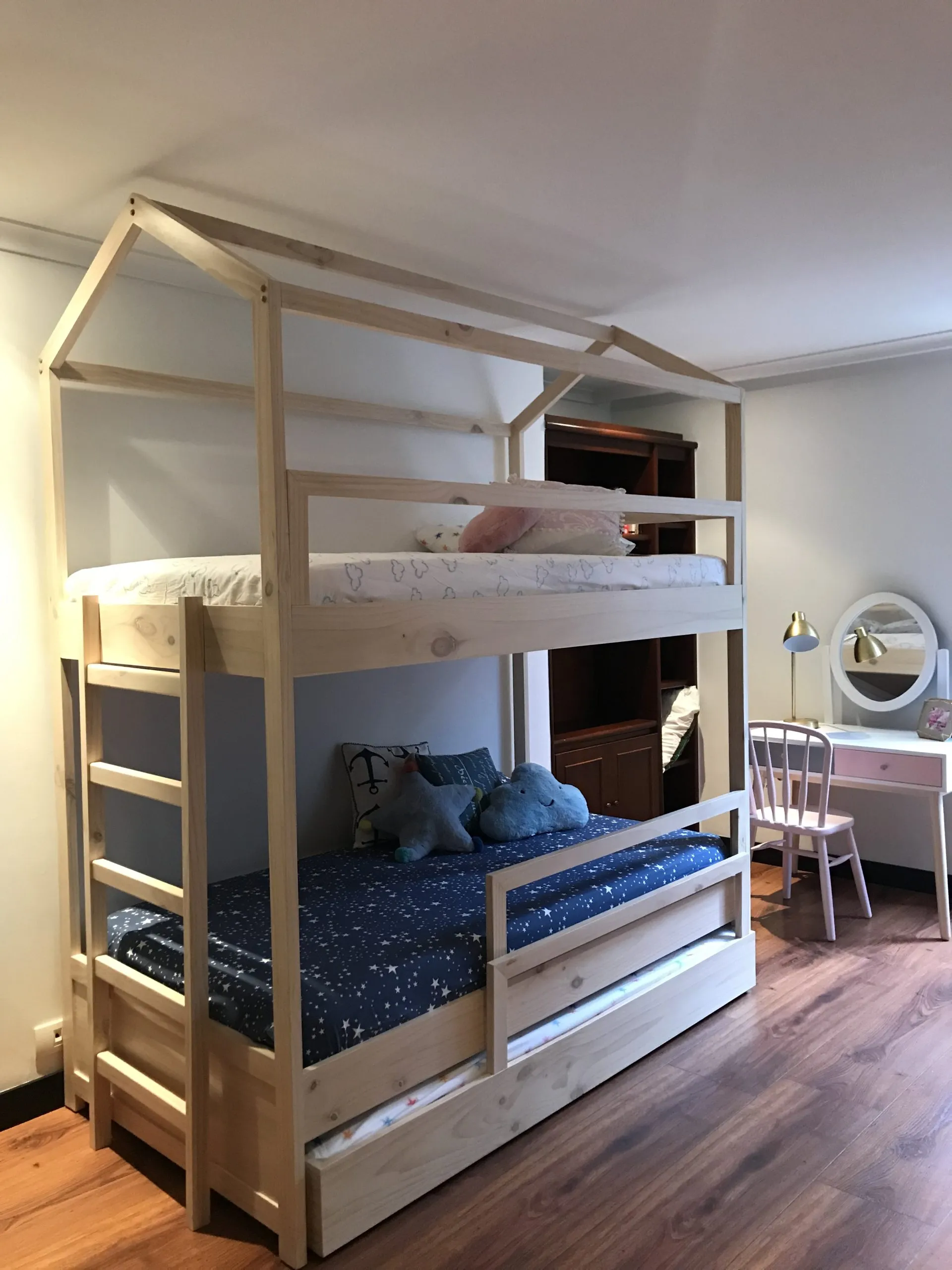 La cama casita triple podrá darle un estilo único a la habitación de tus pequeños para compartir en familia o con amigos de una forma divertida, recuerda que puedes escoger la madera, y el color del acabado. medidas 100 cm x 1.90 cm – 1.20 cm x 1.90 cm. *No incluye el colchon ni la decoracion*