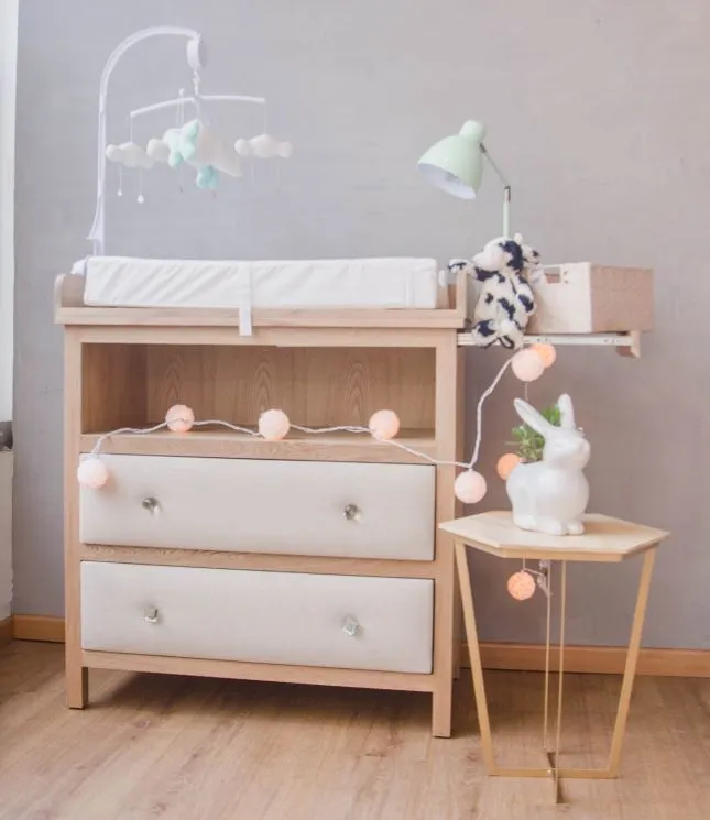 Puedes escoger la combinación de la madera y el color de la tela. Tiene dos cajones grandes con rieles para guardar su ropa según la etapa en la que esté tu bebé, un espacio de repisa para decorar y una bandeja extraíble, la cual podrás abrir y cerrar, en ella puedes ubicar una canasta con las cosas que seguro necesitarás a la mano en ese momento.