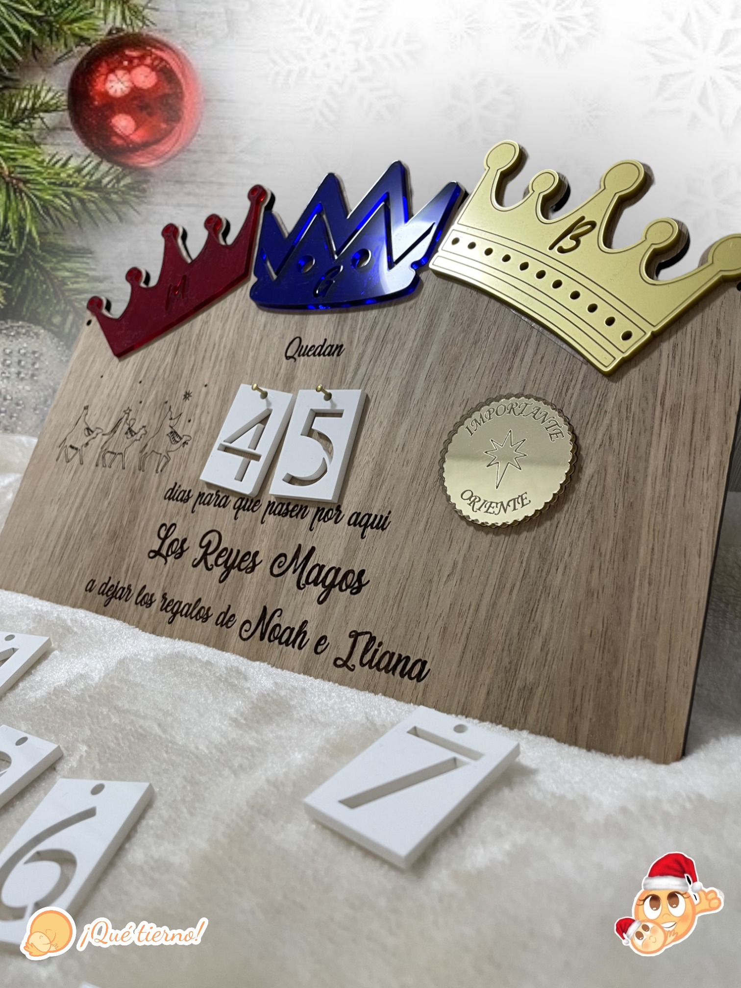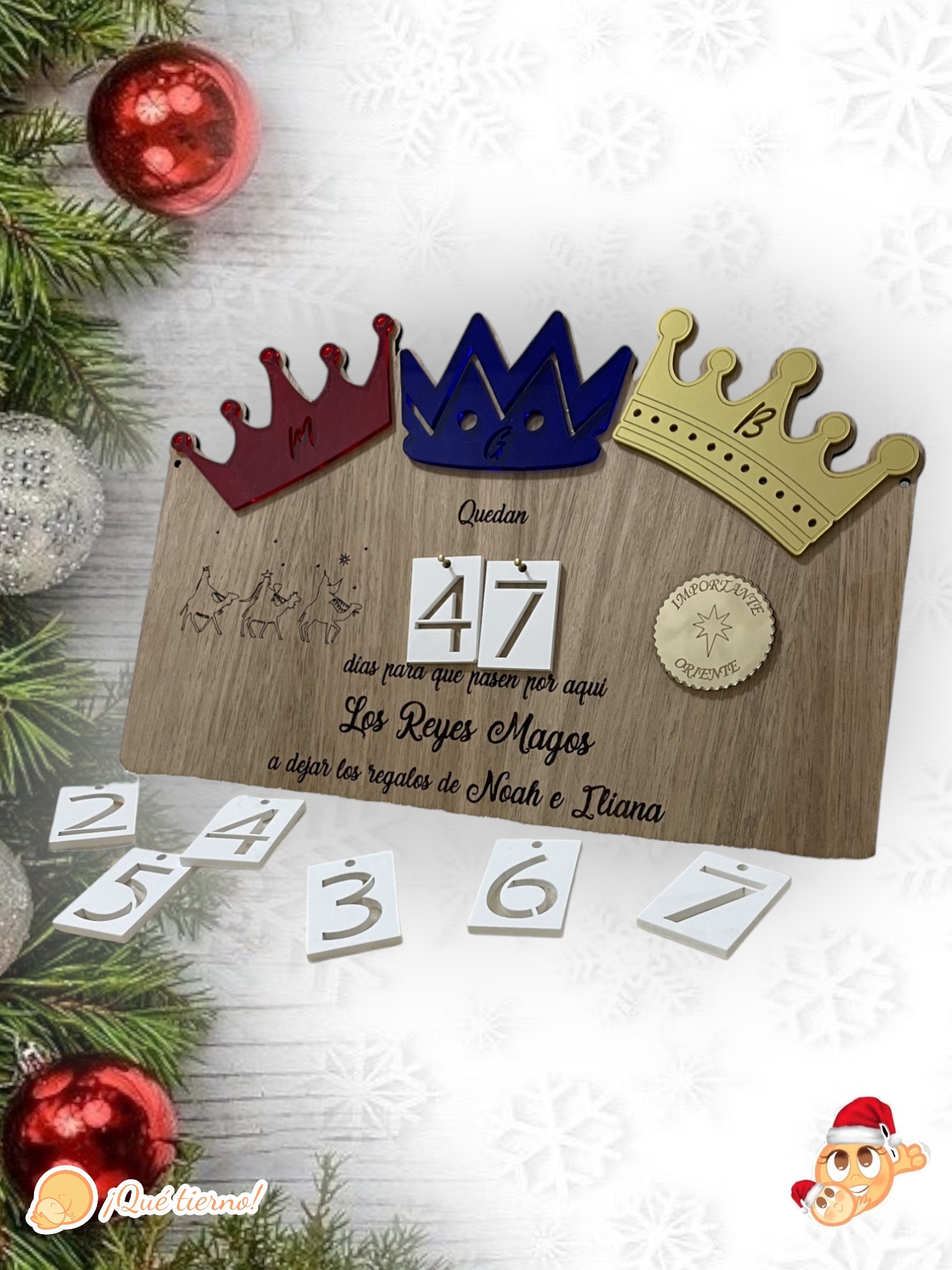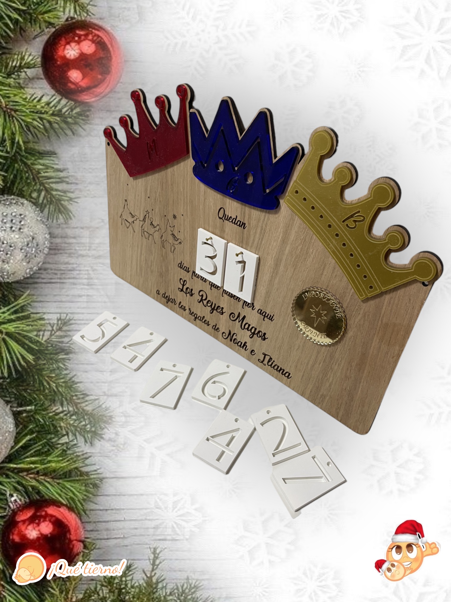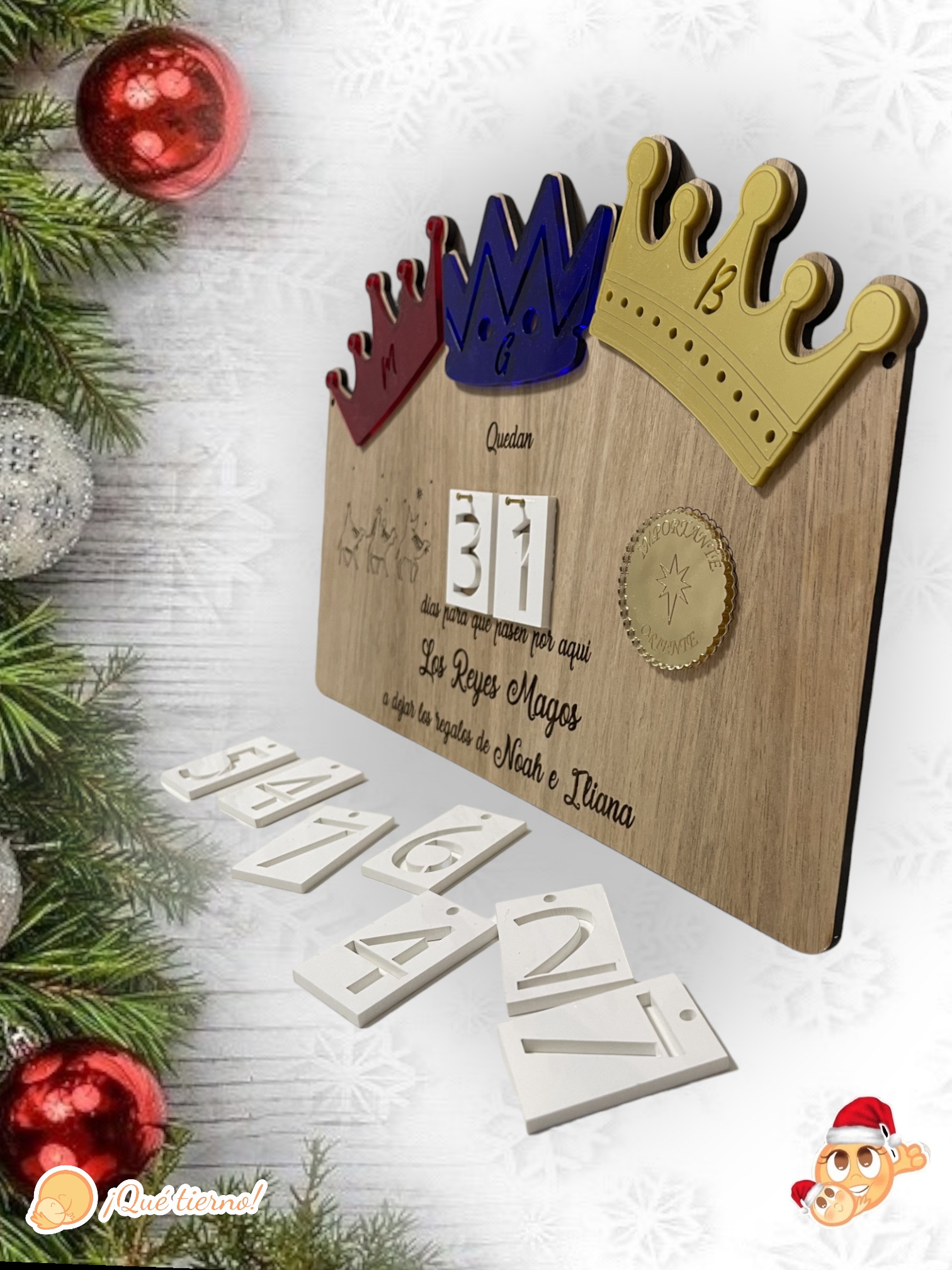 La placa está fabricada en madera de alta calidad y tiene un diseño moderno y elegante. Las coronas de los reyes magos están hechas en metacrilato de tres colores: azul, rojo y dorado. El contador de días está compuesto por números del 0 al 99 de metacrilato blanco que se pueden cambiar manualmente.