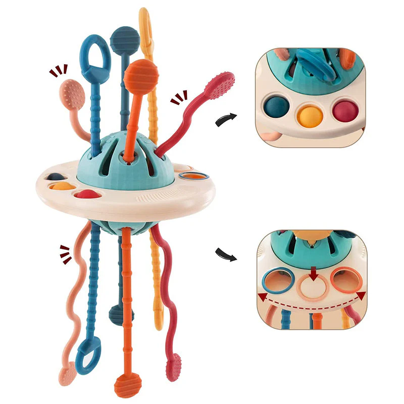 Si quieres que tus niños se mantengan jugando durante horas, entonces este juguete sensorial e interactivo es perfecto para ellos! Es imprescindible para bebés y niños pequeños, para que puedan jugar con las cuerdas del UFO con mucho gusto. No más llantos en el coche, en el centro comercial o al aire libre, porque se convertirá en su juguete de consuelo y el más favorito!