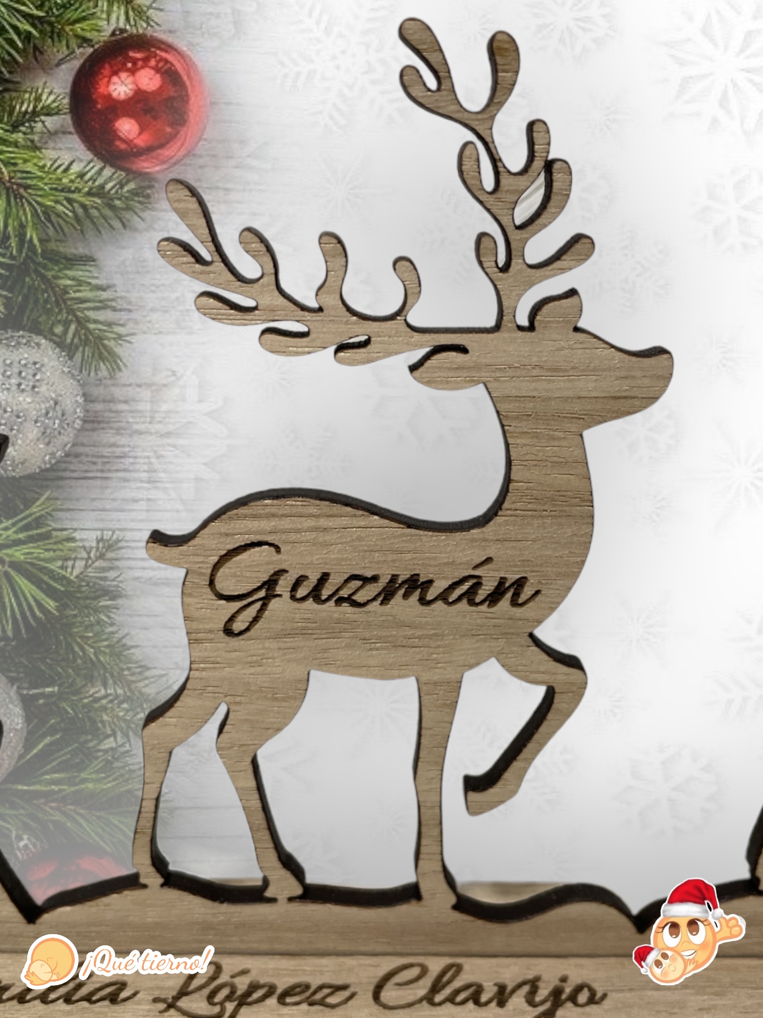Los renos están hechos de madera con los nombres grabados a fuego o en relieve en alguno de nuestros metacrilatos de colores.