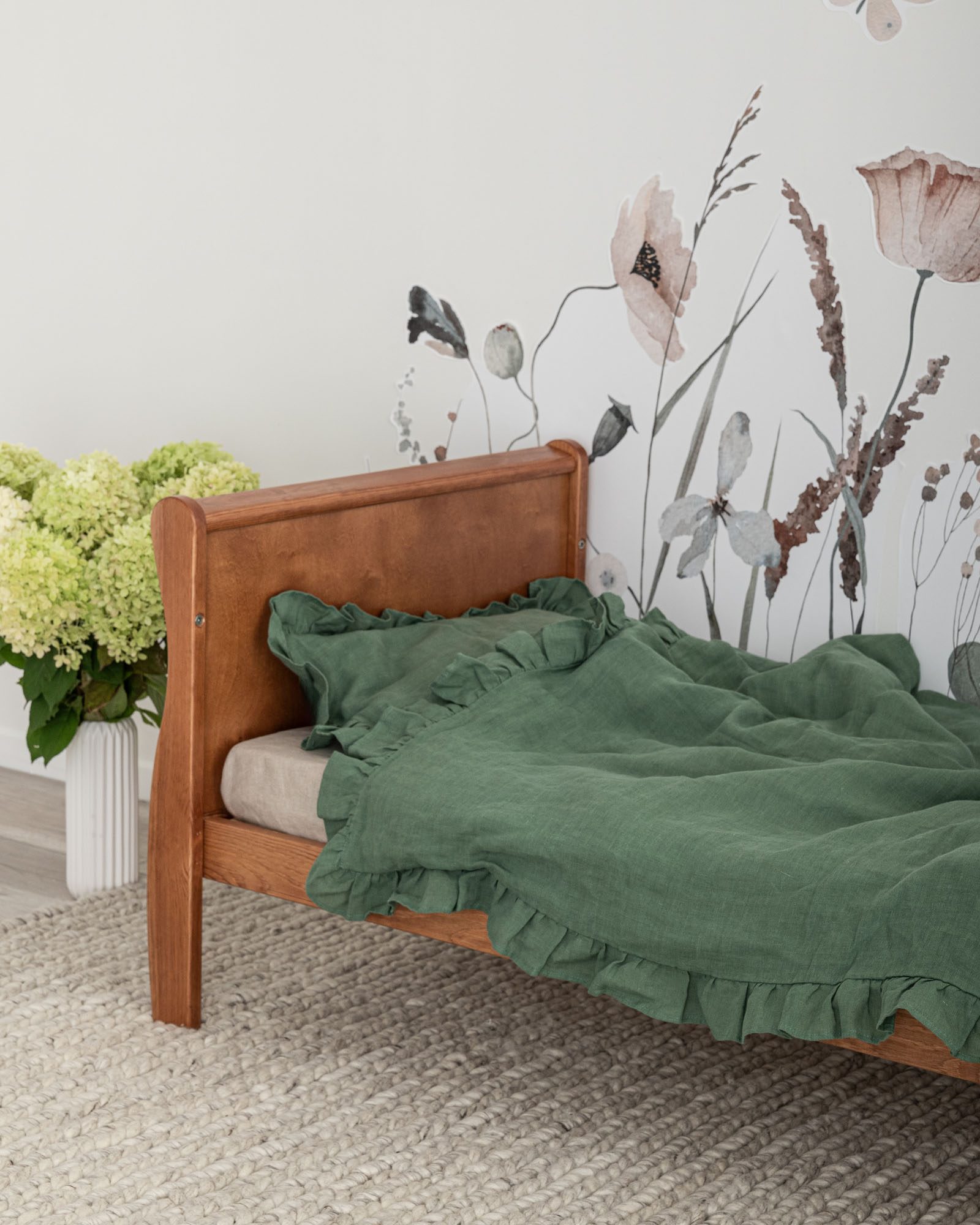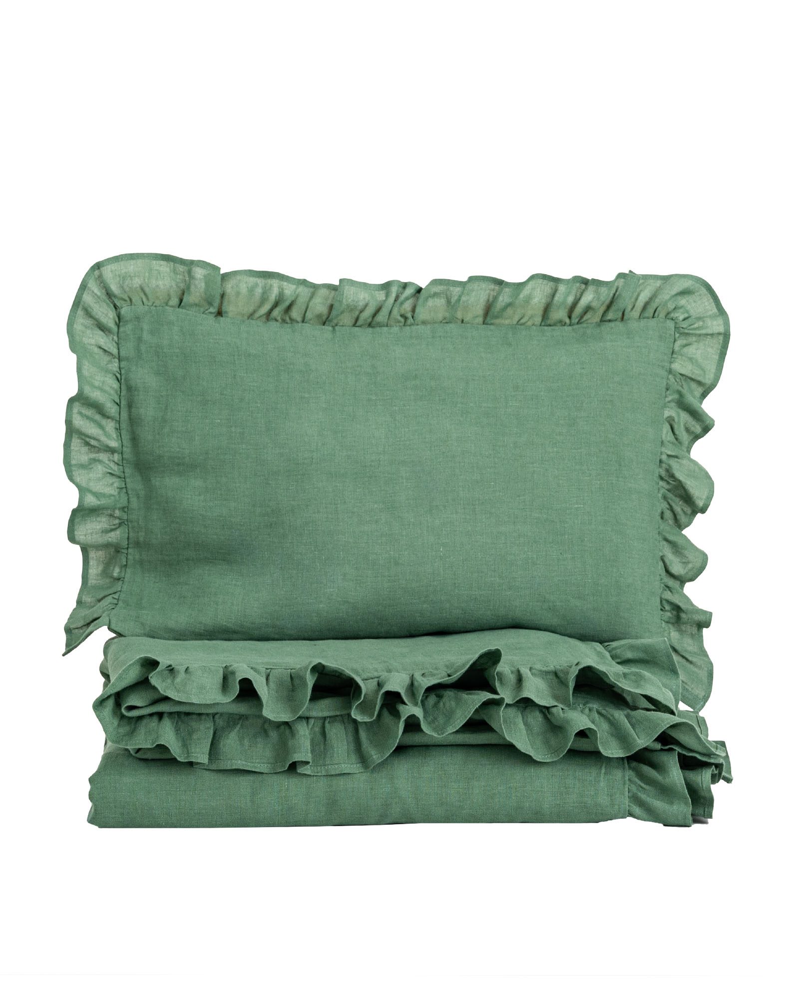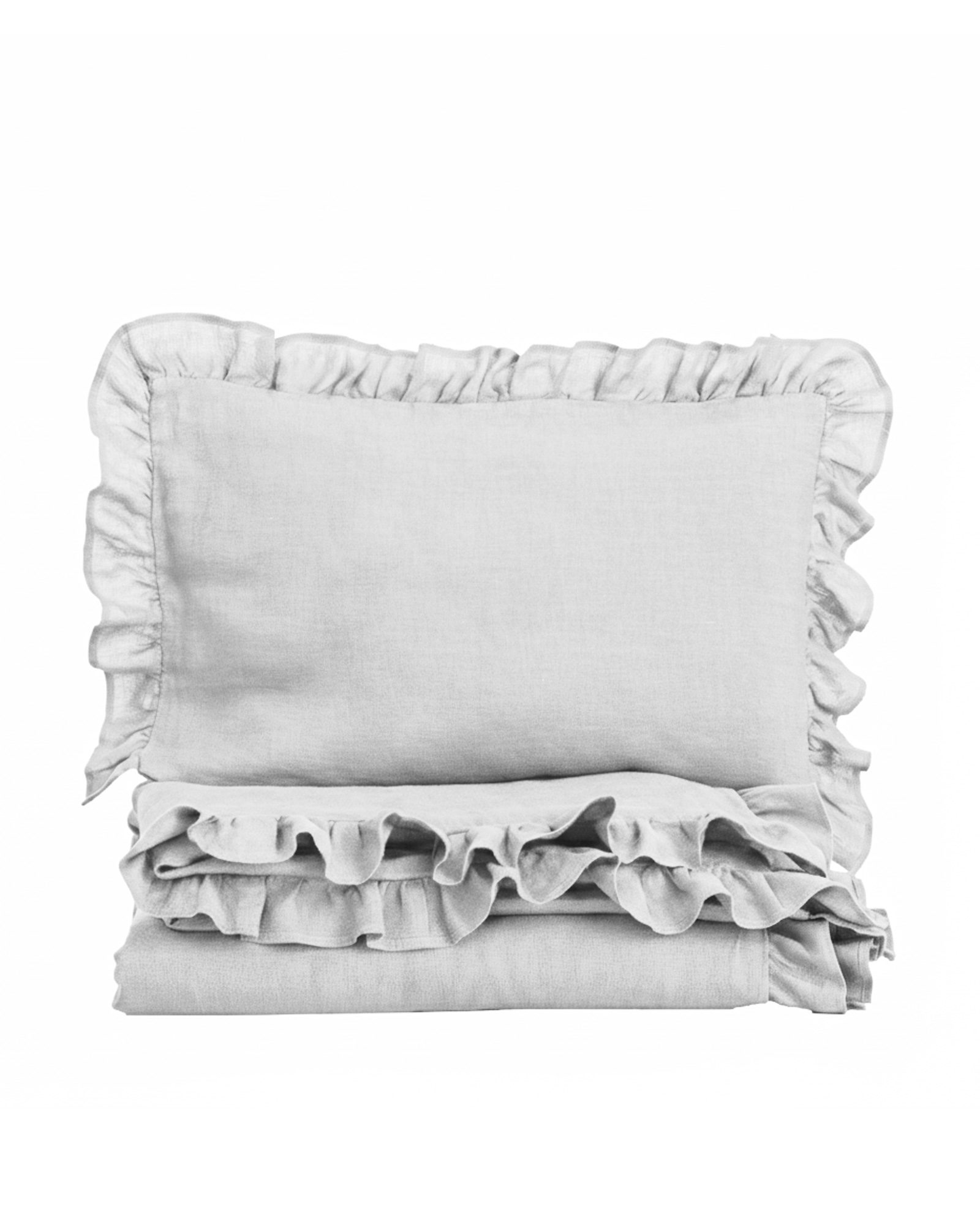 Este juego de ropa de cama incluye una funda nórdica y una funda de almohada, ambas decoradas con encantadores volantes. La funda nórdica se cierra con una cremallera oculta, mientras que la funda de almohada cuenta con un cierre clásico tipo sobre. Cada pieza está hecha a mano en Polonia, con cuidado en cada puntada, para que sepas que está hecha para durar.