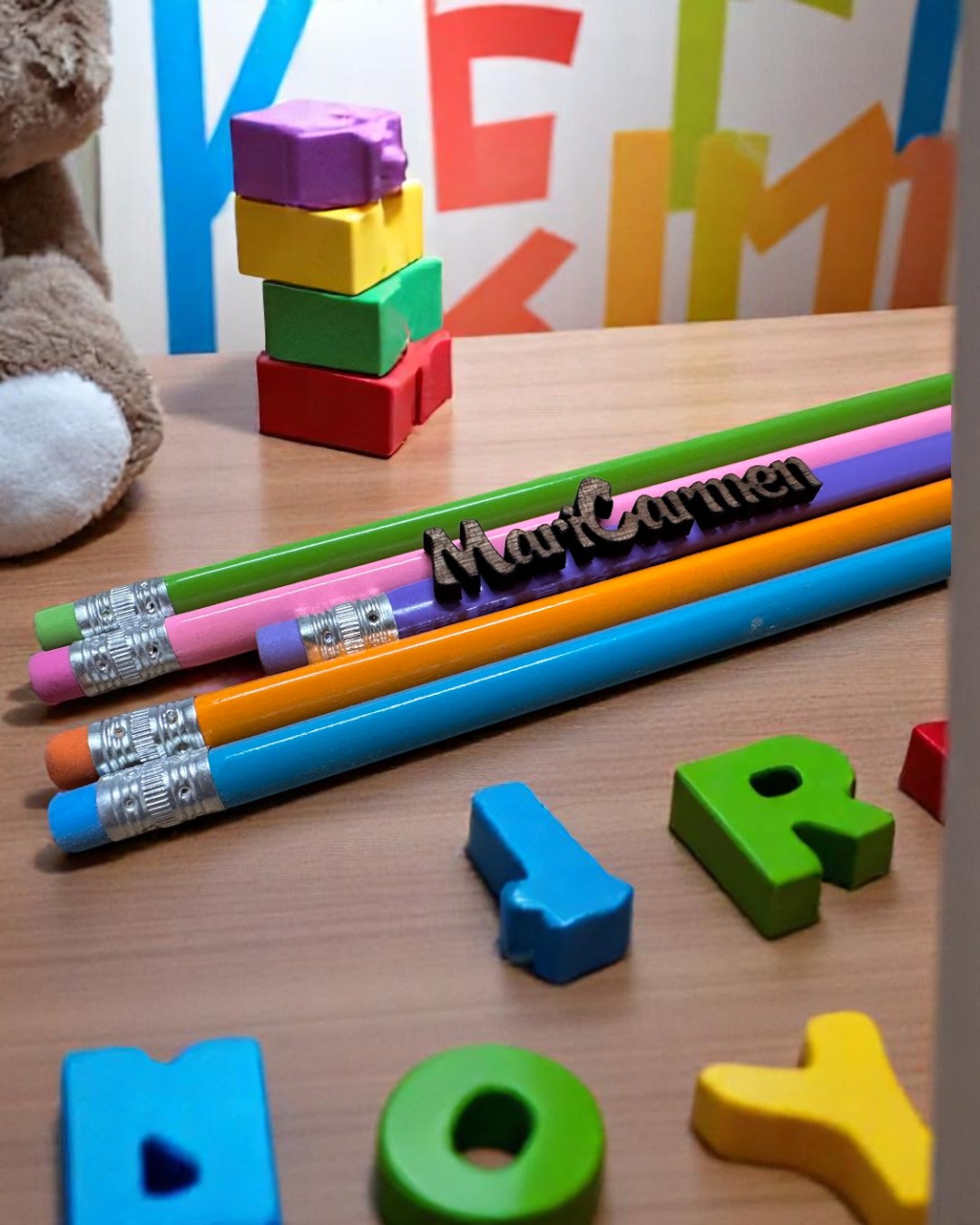 Personalización con el nombre en madera natural, cortado con láser y pegado al lápiz.