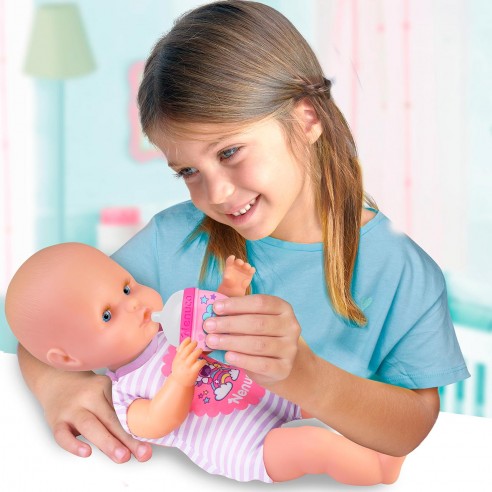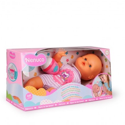 Nenuco blandito con pijama a rayas con un unicornio dibujado en él. Lleva un biberón a juego que además es un sonajero.