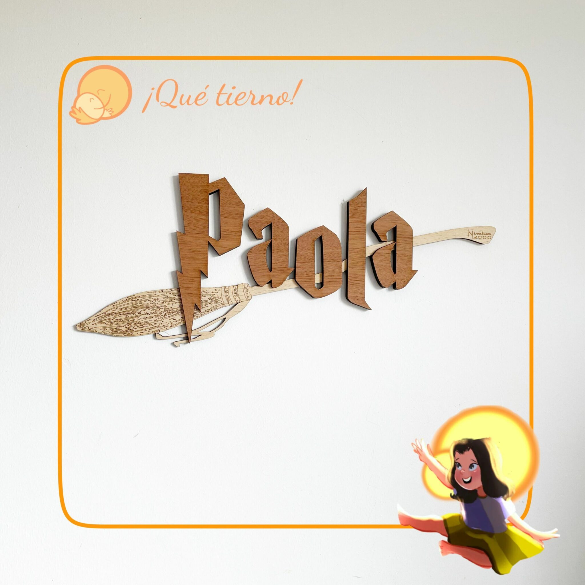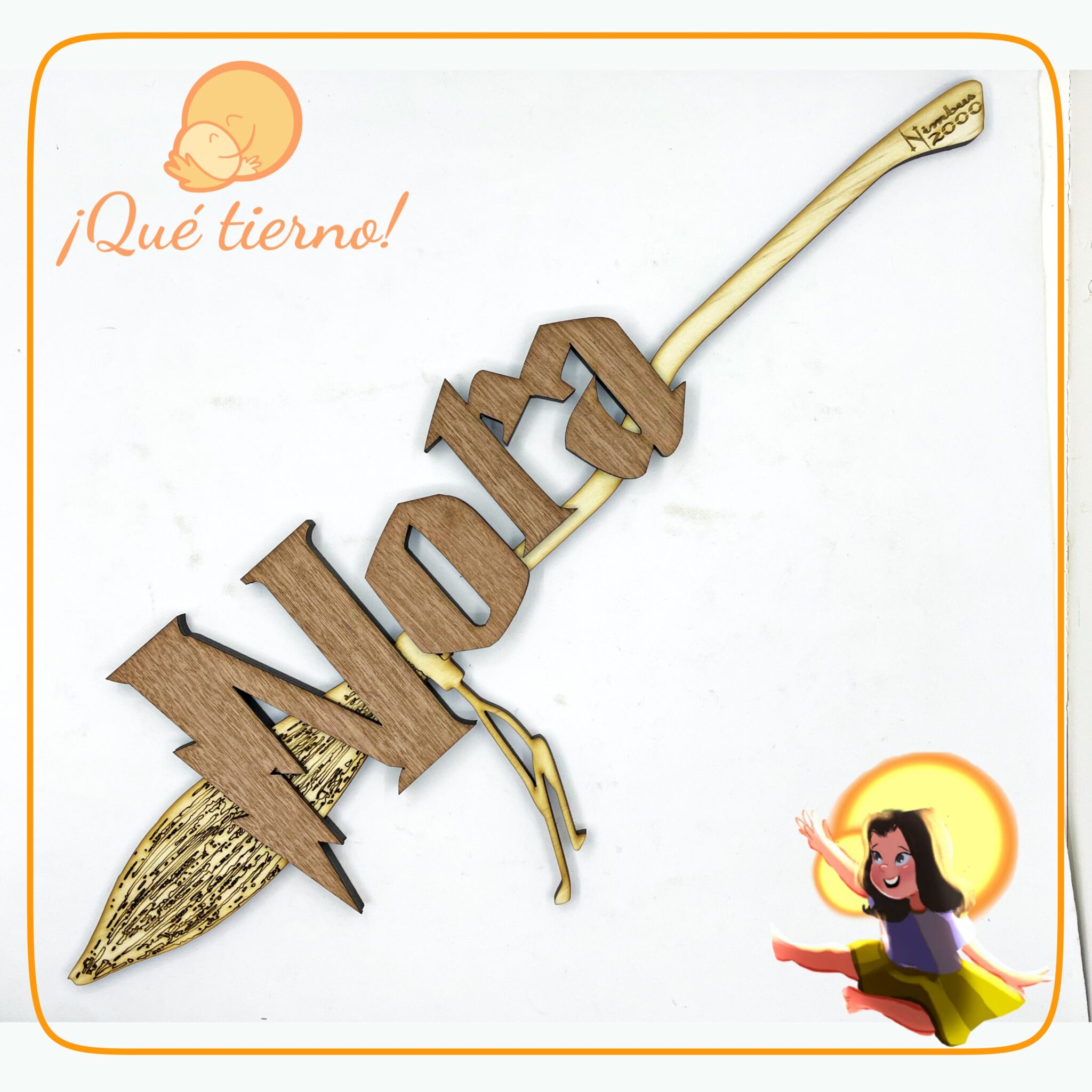 Nombre con la tipografía de Harry Potter y subido a la súper escoba mágica Nimbus 2000