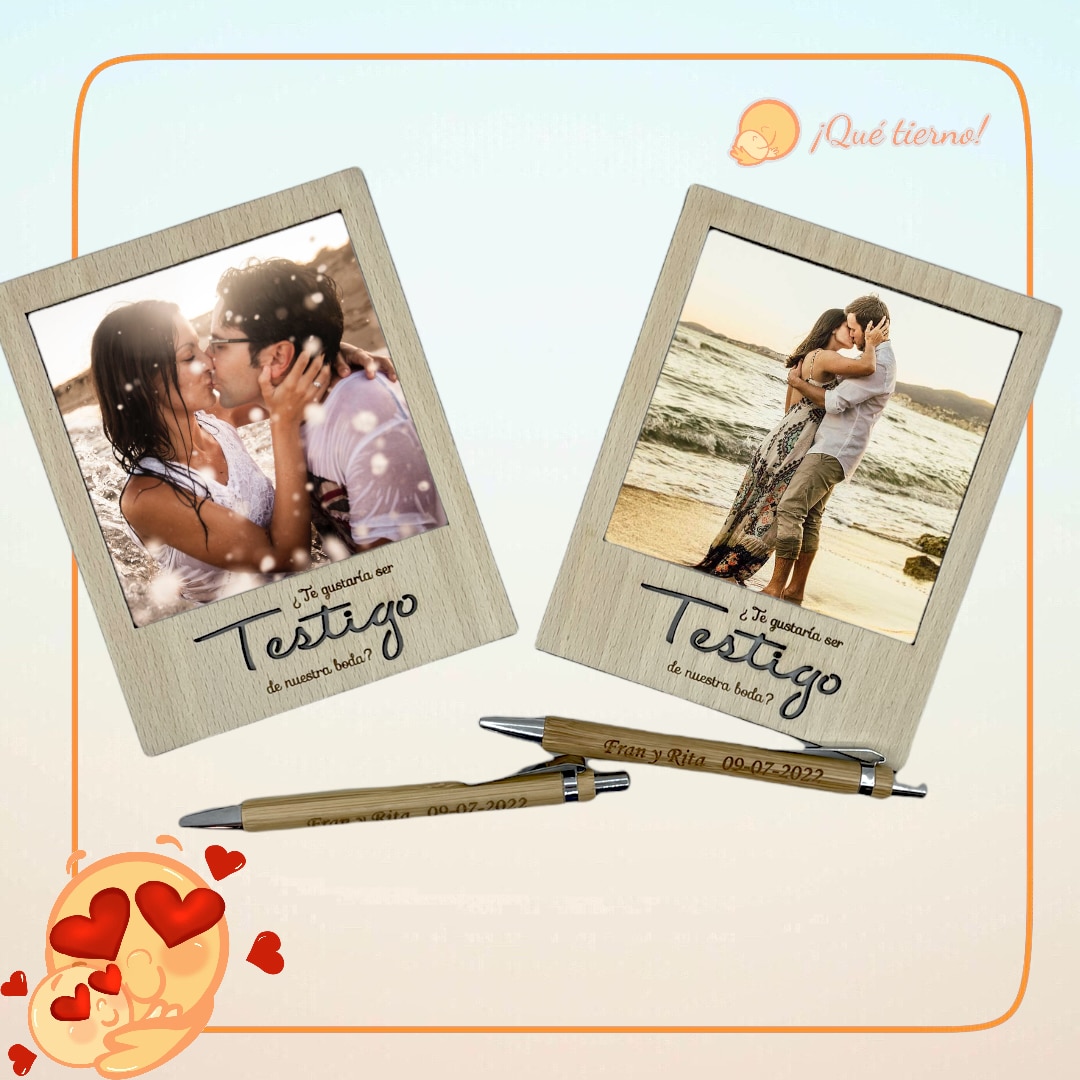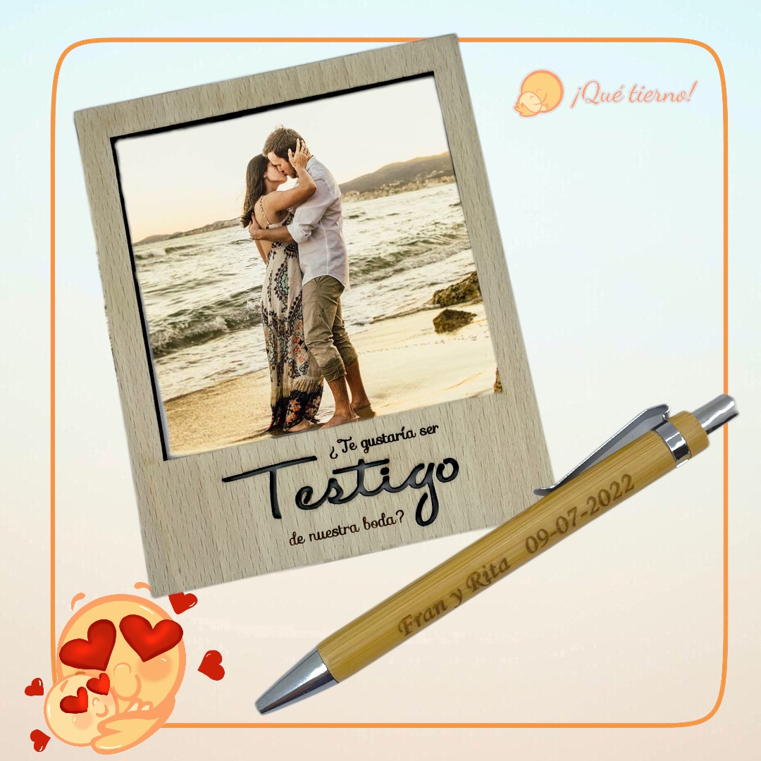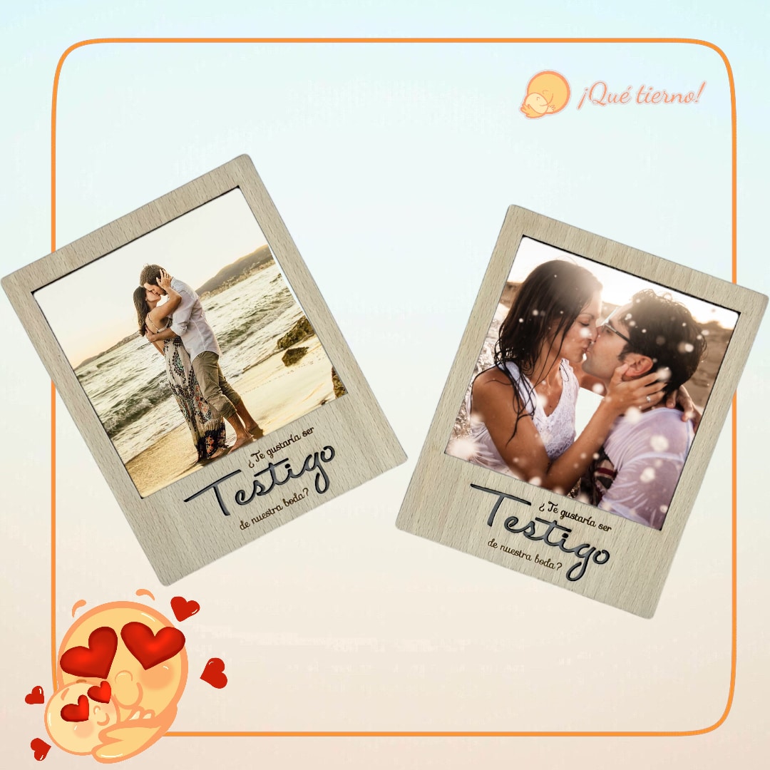 Portarretrato con forma de foto «polaroid» con una inscripción personalizada para esas personas que quieres que te acompañen en ese día tan especial como puede ser una boda o un bautizo.