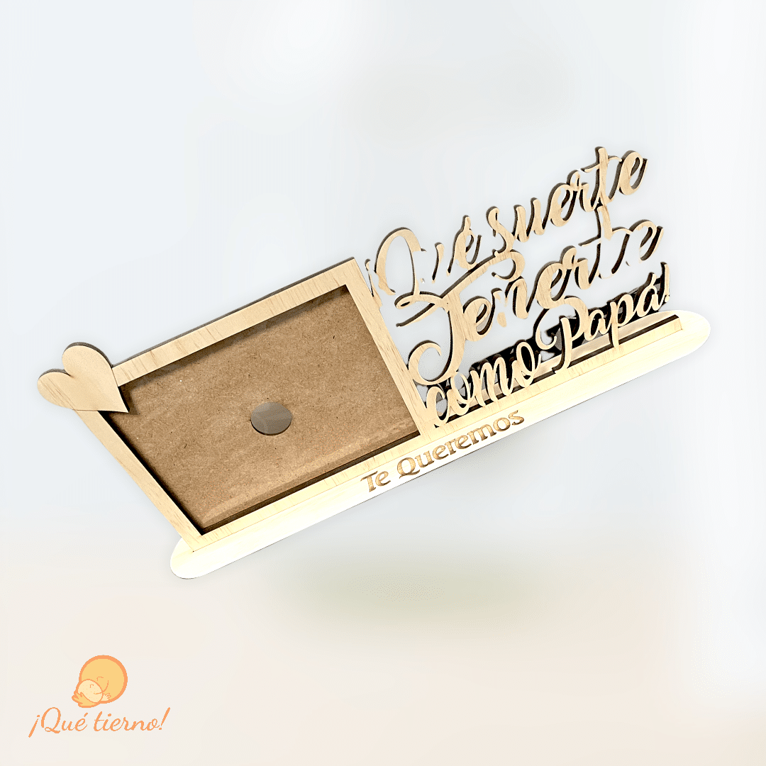 El Portarretrato «Qué suerte tenerte como Papá» está hecho con madera rechapada de pino, haya o fresno (según existencias) y en relieve con madera rechapada de roble para un aspecto más impactante.
